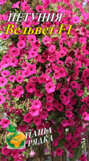 Петунія “Вельвет” F1 ампельна. Чудове забарвлення, темно-рожево-фіолетові плями та смуги на білому тлі. Особливо приваблює коротким періодом вирощування, тривалим цвітінням і витривалістю. Однорічна рослина. Вирощують через розсаду в березні-квітні, або посівом насіння у відкритий грунт в травні-червні. Цвіте рясно з червня до заморозків. Використовується для оформлення клумб, рабаток, балконів, садових ваз та підвісних горщиків.